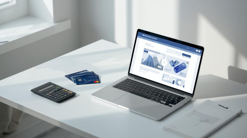Pessoa comparando opções de cartões de crédito sem anuidade no notebook com cartões genéricos sobre a mesa.
